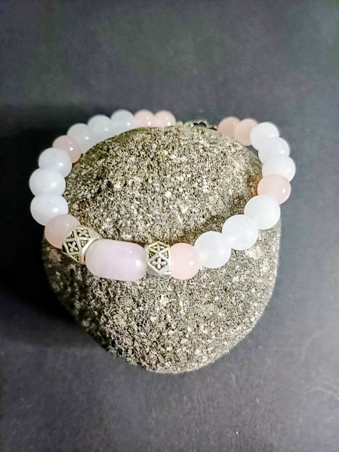 pierre de quartz rose et perle de verre blanche, fermoir en acier inoxydable
