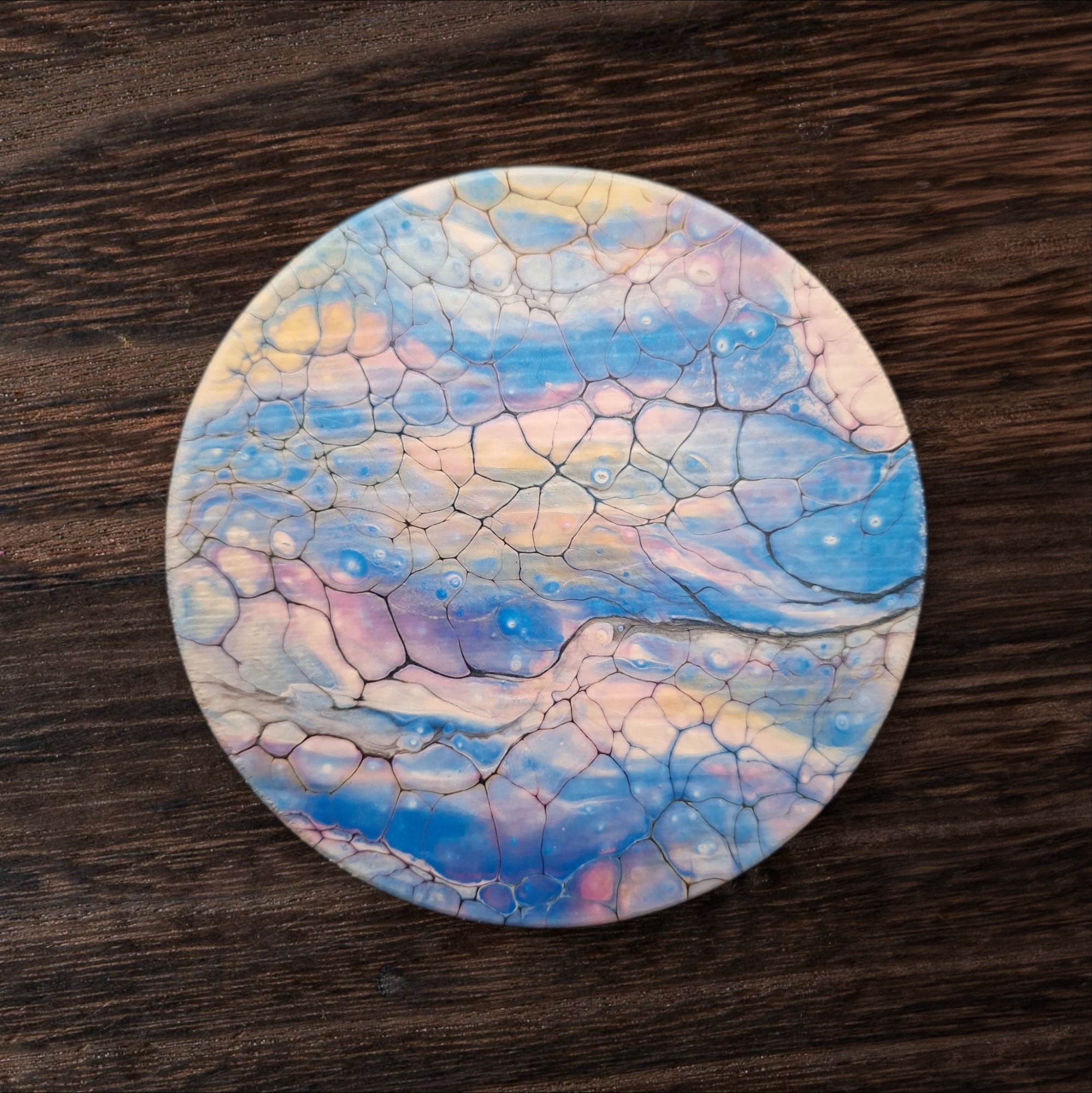 Petit tableau abstrait sur bois (10,5 cm), technique swipe/bloom.