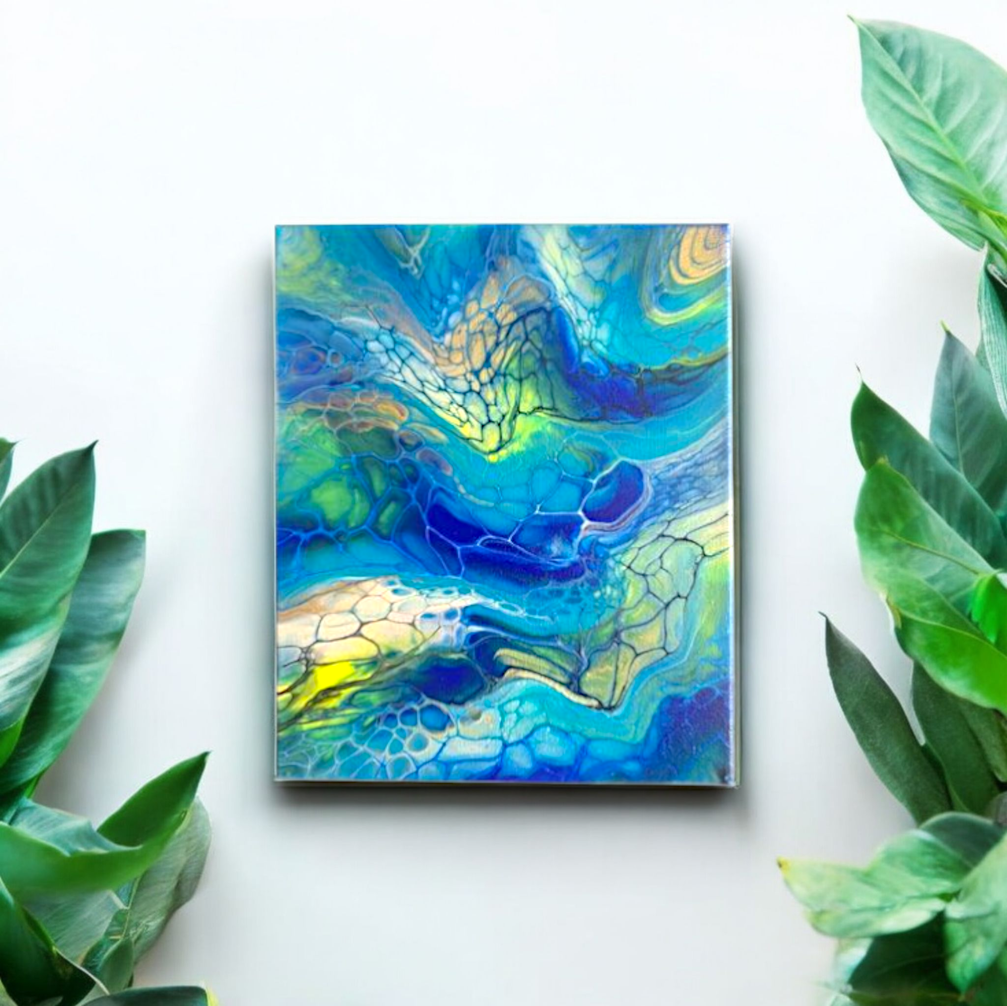Peinture abstraite n°176, taille 22×27 cm aux nuances vibrantes de bleu turquoise, dark ultramarine, beige et or. Évocation d’un monde marin mystérieux, aux reflets lumineux. Œuvre originale signée Essy Art.